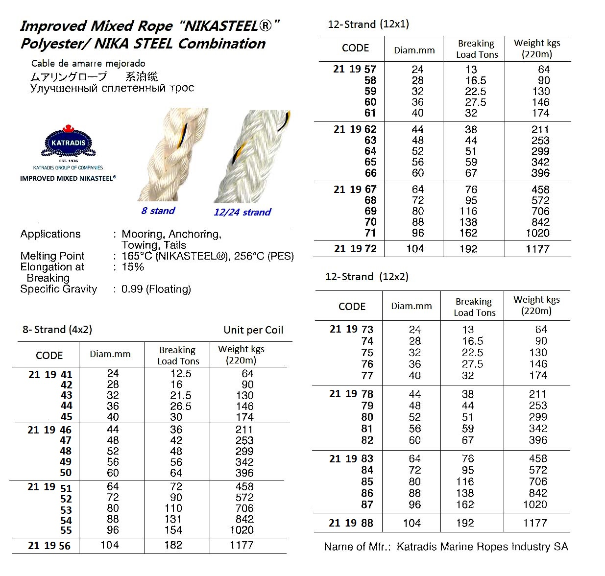 211963 MOORINGROPE,IMPROVEDMIXROPE,POLYESTERCOMBINATION,NIKASTEEL,12-STRAND(12X1),48MM,BTL:44TON